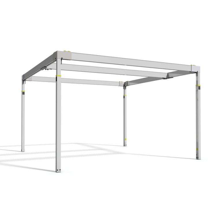 The free-standing rail system is a mobile system that covers the entire room. It is simple to put up, take down and transfer from one location to another. The system is made of lightweight aluminium and available in two standard sizes: 3 x 3 metres and 4 x 4 metres. It has a lifting capacity of up to 350 kg and its height is fully adjustable up to 284 cm. Guldmann GH1 lifting modules can be used in this full-room solution.