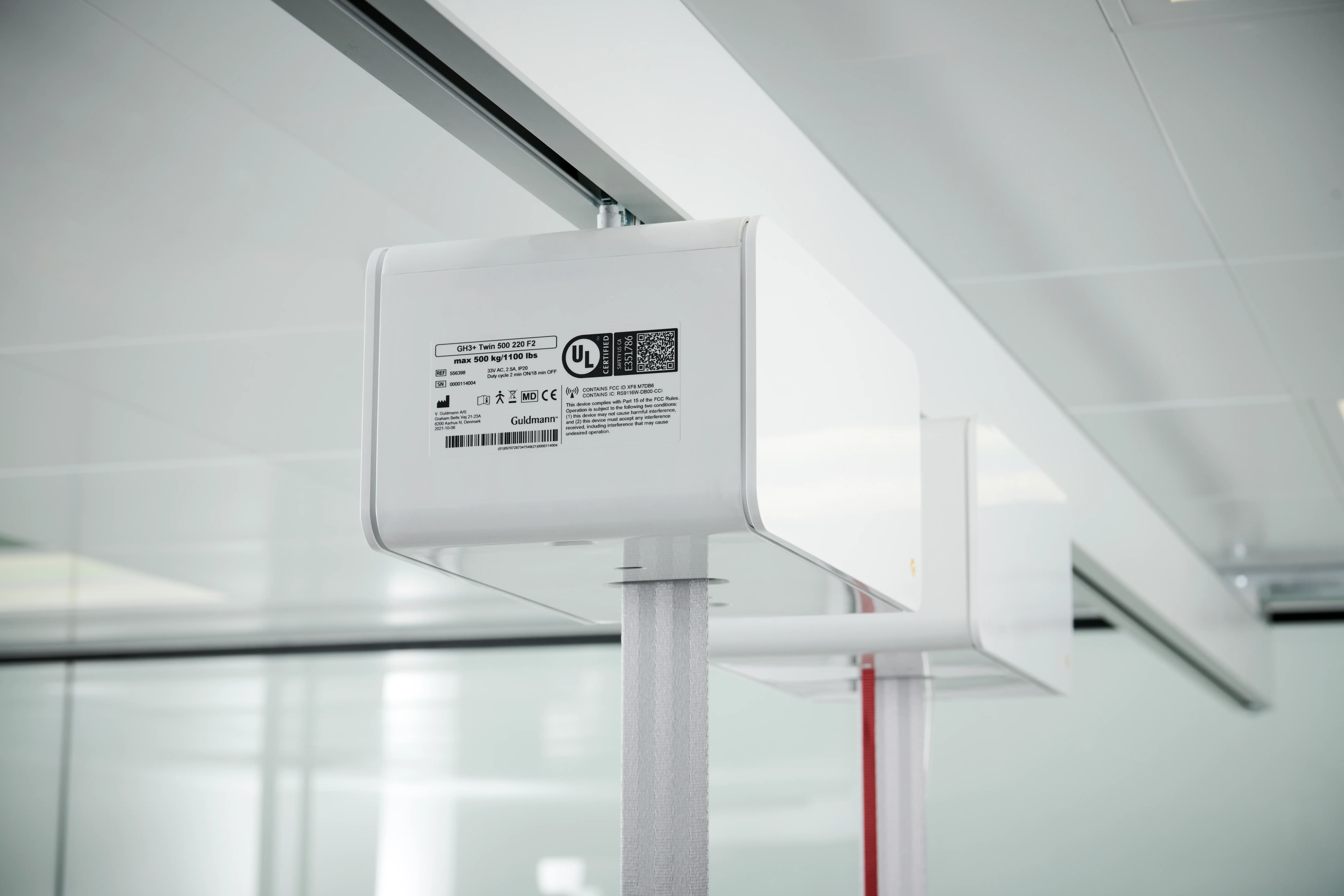 The GH3 Twin ceiling hoist comprises two GH3 lifting modules and uses two lifting straps. This module is designed for lifting and moving heavy bariatric people, and is also ideal for horizontal lifts in combination with Guldmann Horizontal Lifters.