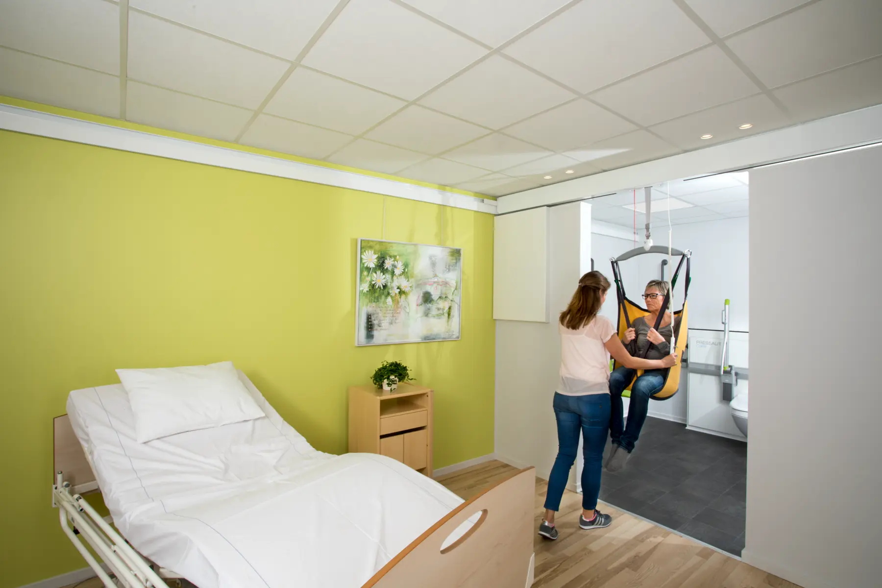 If a continuous traverse rail system is chosen – which provides full coverage for efficient moves directly from the bedroom to the bathroom, for example – the traverse rail can be “parked” discreetly while the lifting hanger and sling are stored in a built-in cupboard.