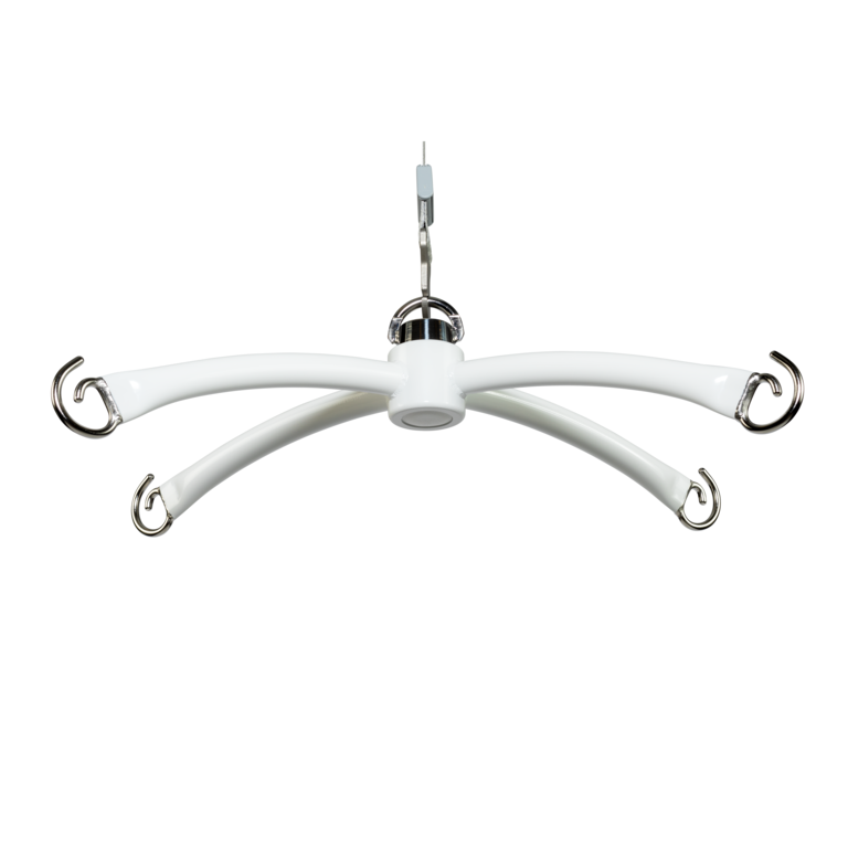 The Cross hanger has four suspension points, weighs 4.6 kg and is made of stainless steel, powder-coated in white.