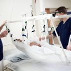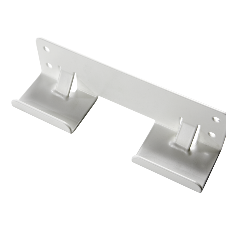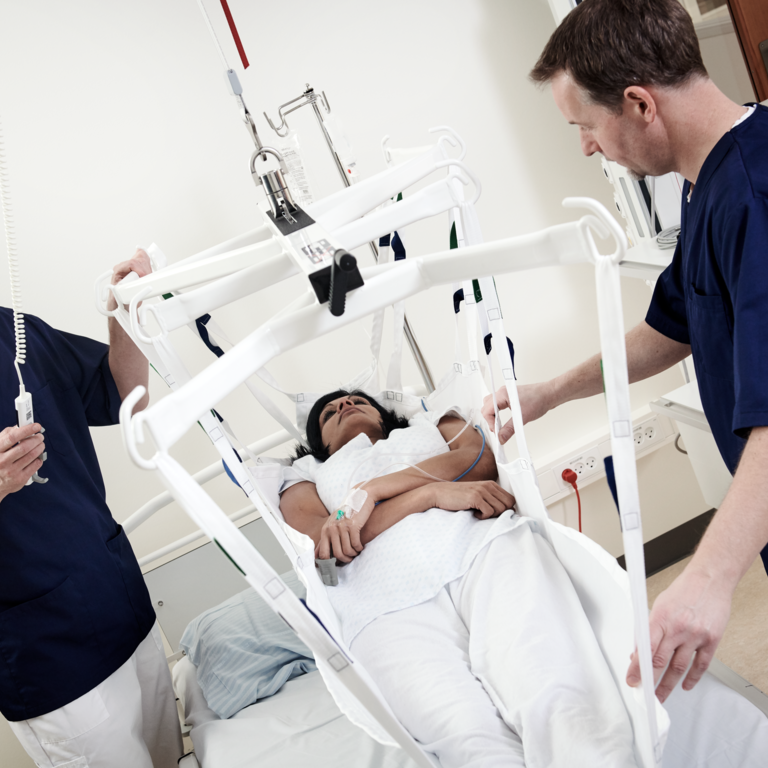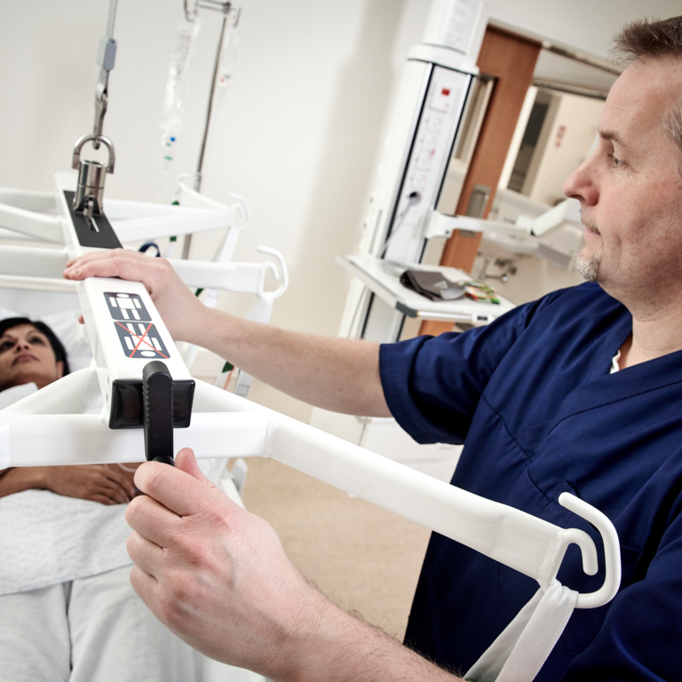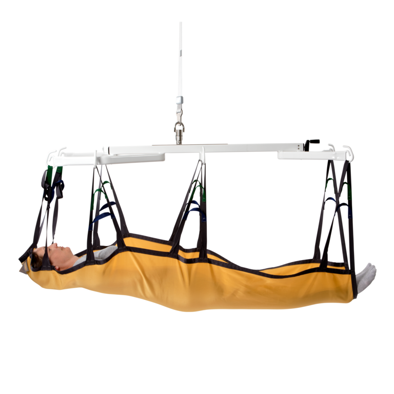 The Horizontal lifting support is stored in a wall-mounted holder and connects and disconnects to the ceiling hoist directly while still in the holder to avoid manual handling.