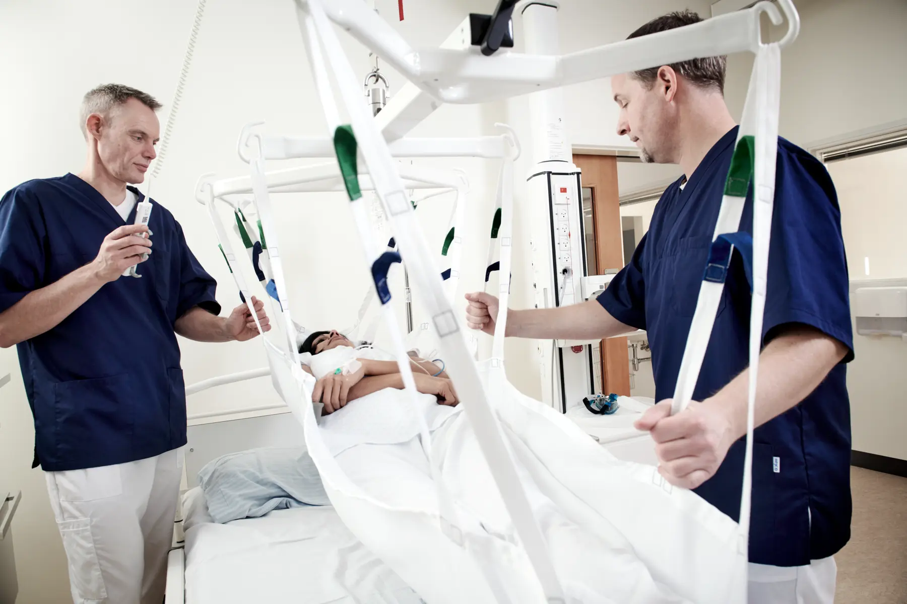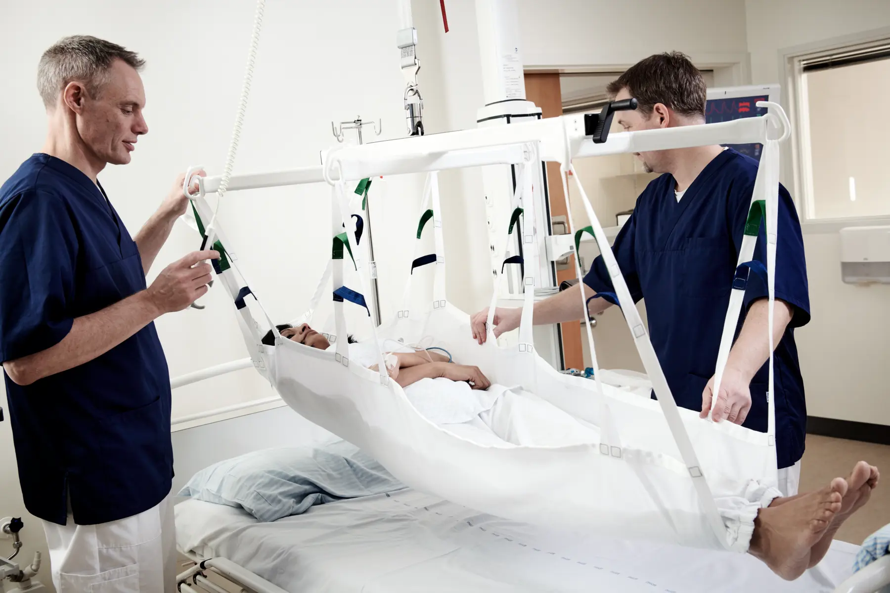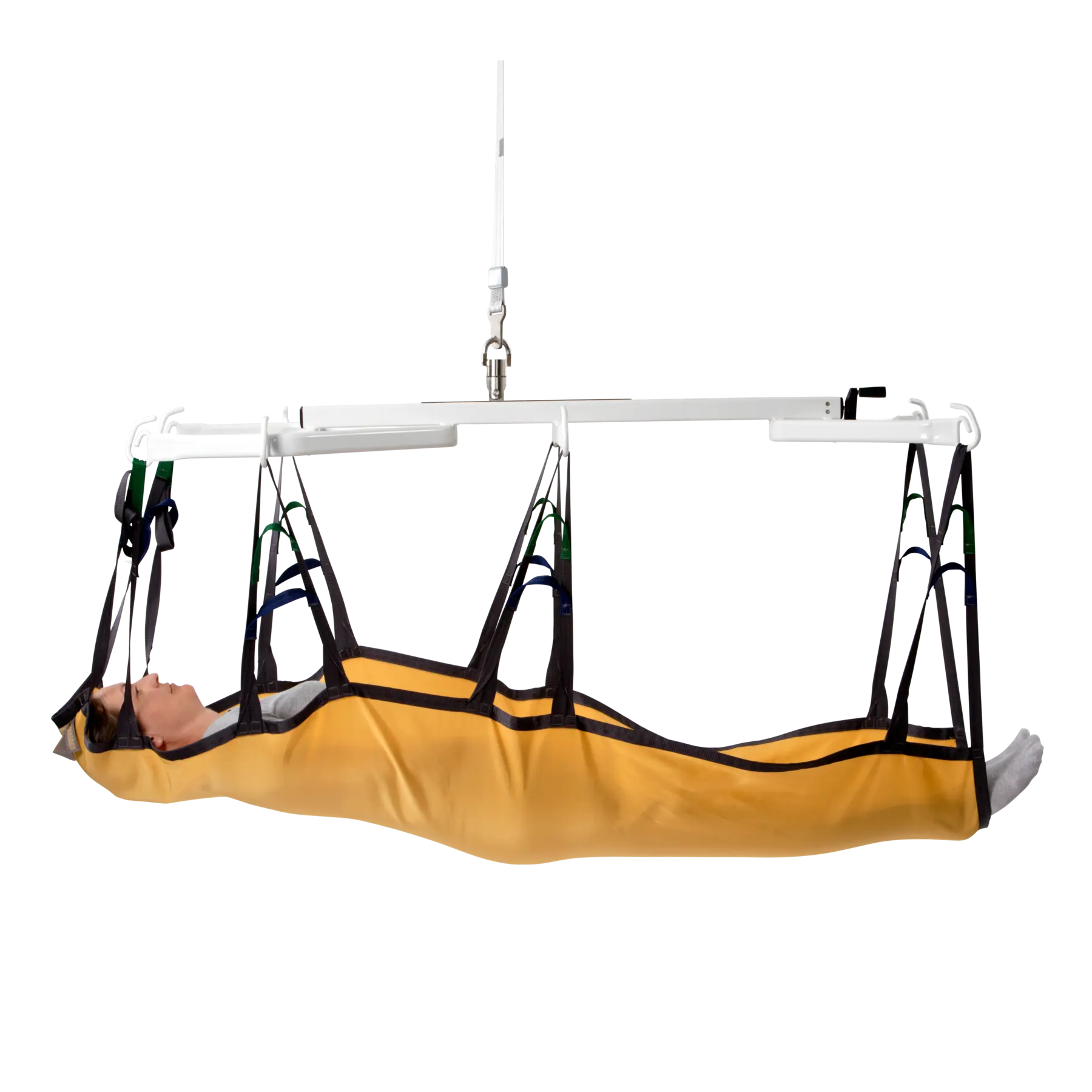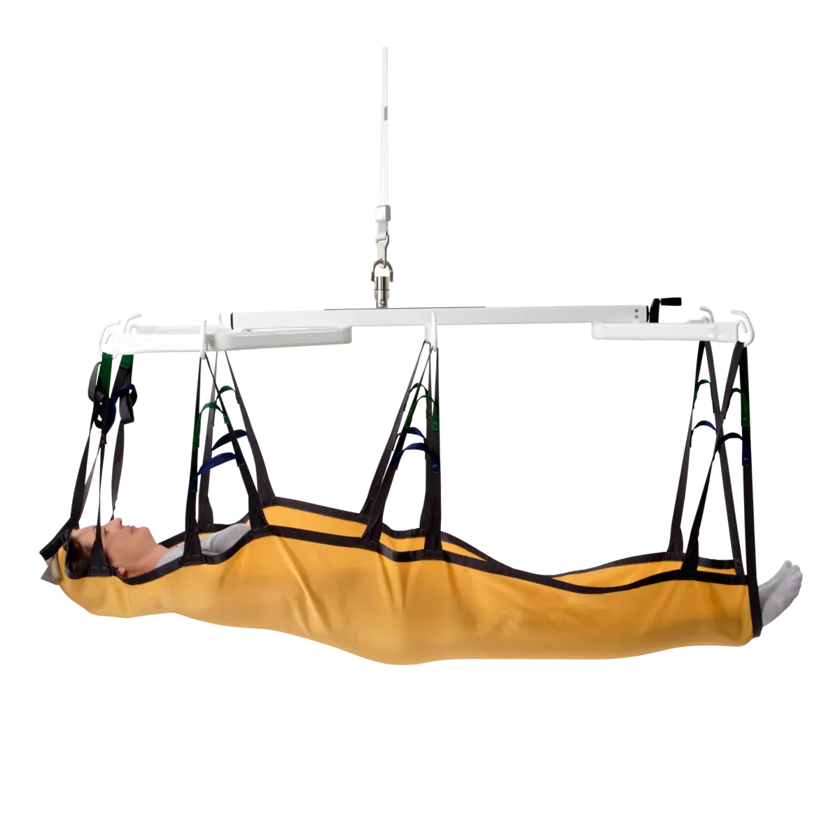 The Horizontal lifting support is stored in a wall-mounted holder and connects and disconnects to the ceiling hoist directly while still in the holder to avoid manual handling.