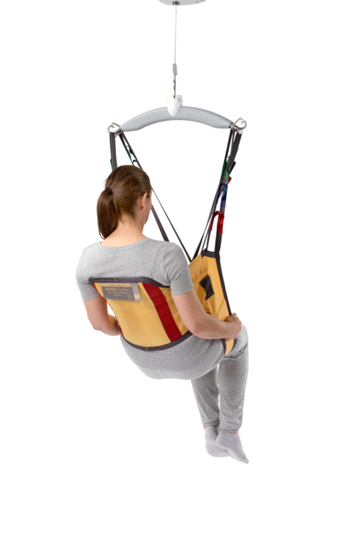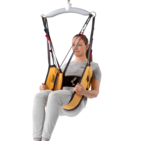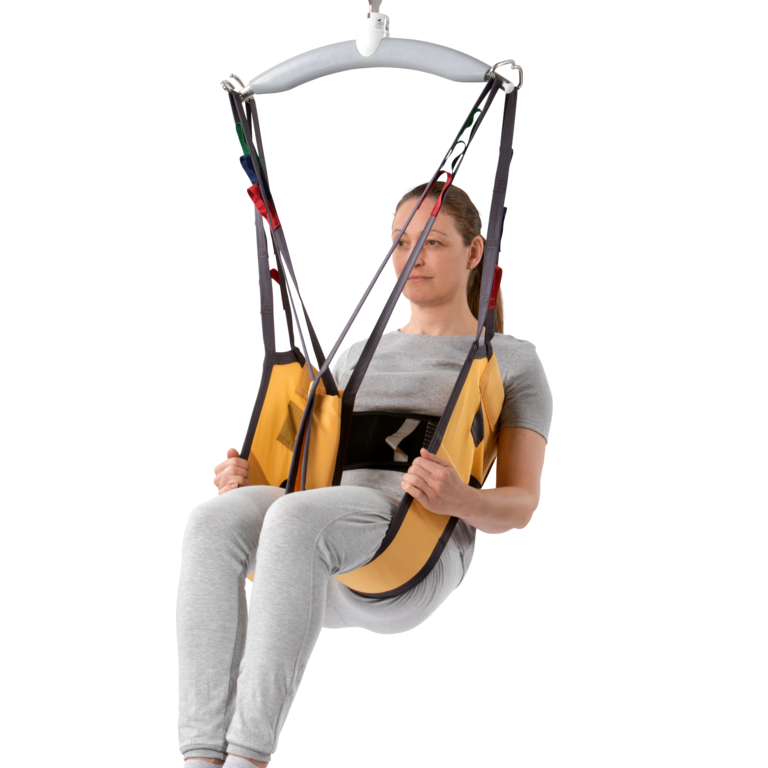 The sling supports the upper body and is secured around the chest and the upper thigh. The elastic support strap must be used together with the sling, and it can be adjusted to suit the individual user. It is ideal for lifting people who can control their heads but have slightly reduced function in their upper body, hips, and thighs.