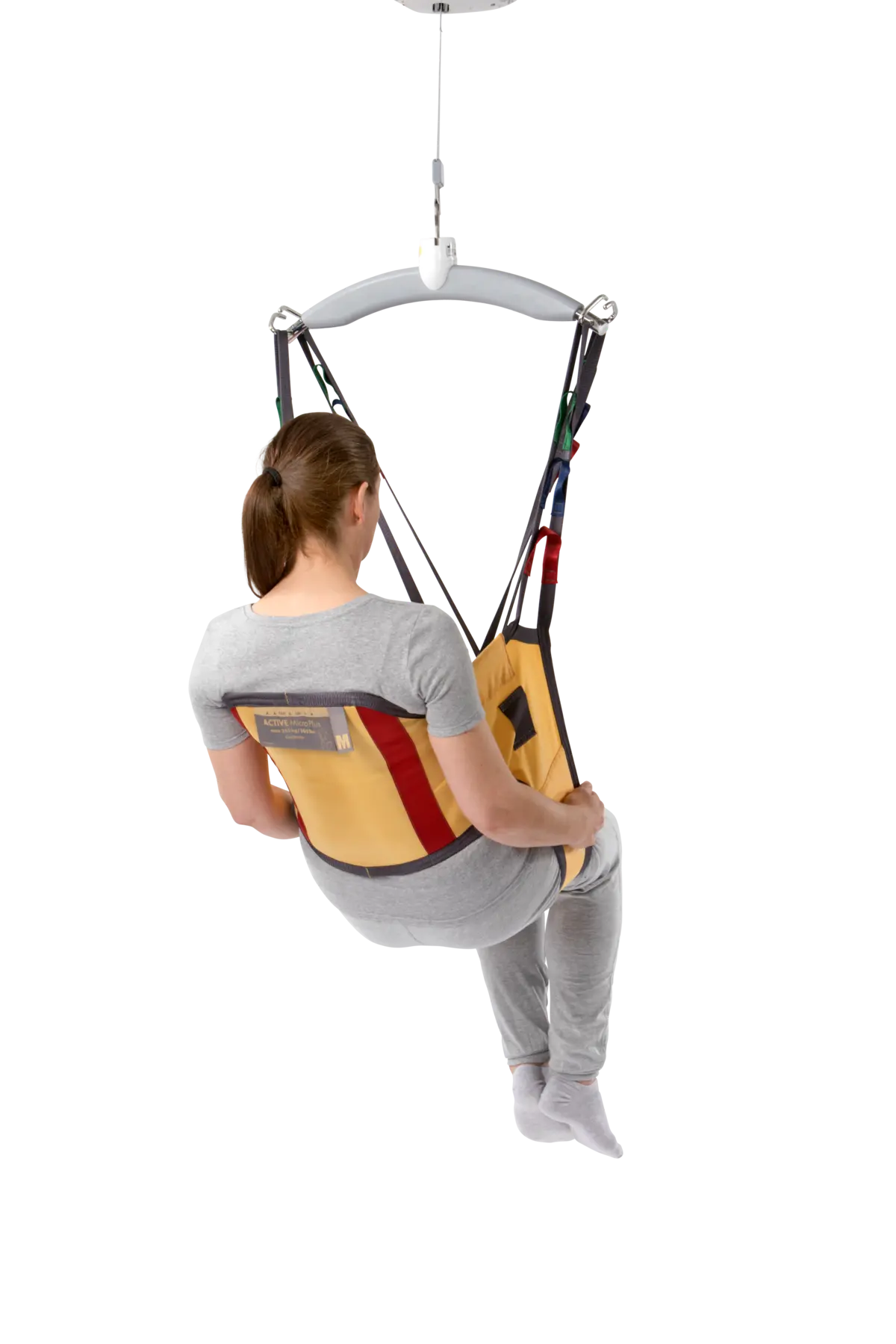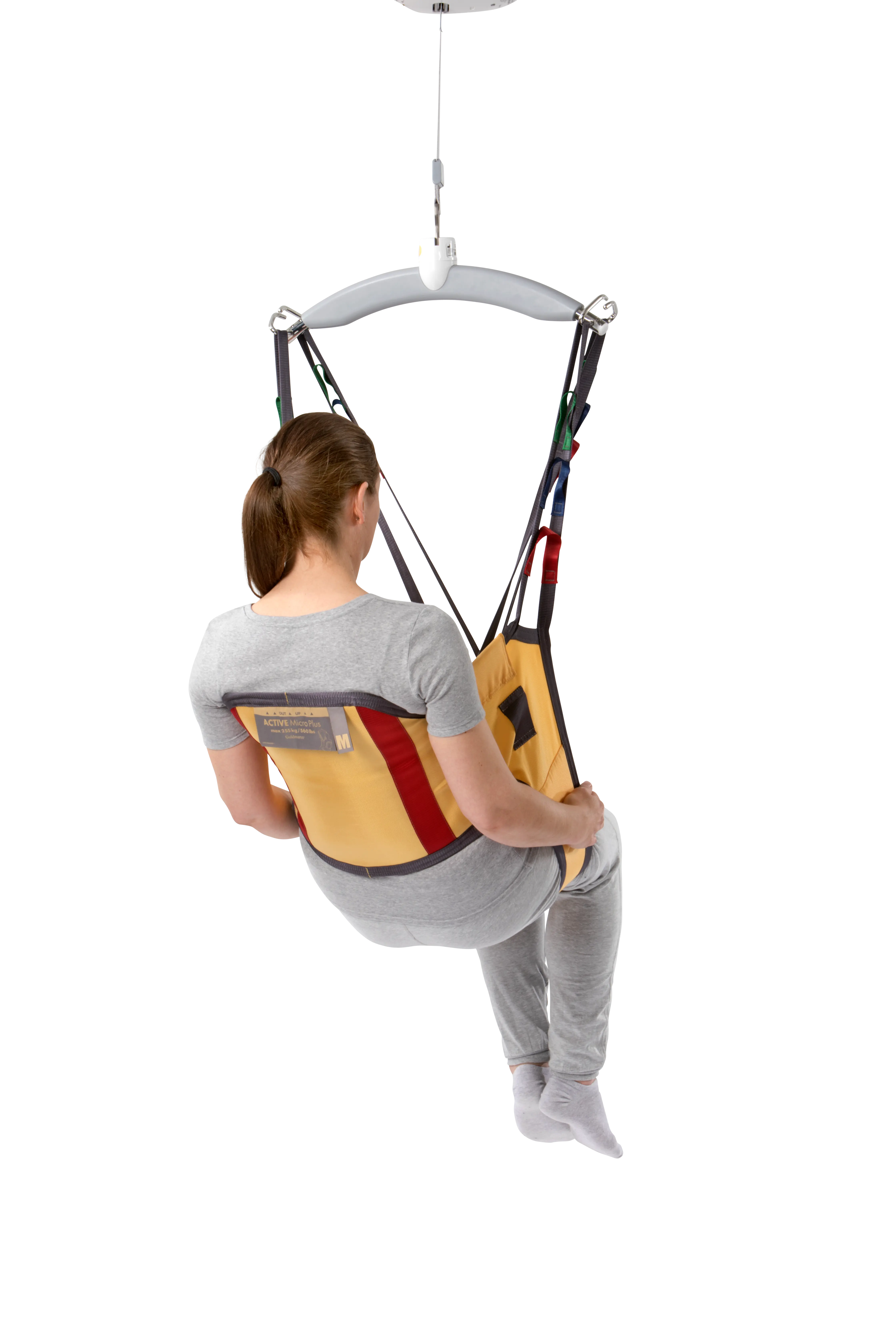 The sling supports the upper body and is secured around the chest and the upper thigh. The elastic support strap must be used together with the sling, and it can be adjusted to suit the individual user. It is ideal for lifting people who can control their heads but have slightly reduced function in their upper body, hips, and thighs.