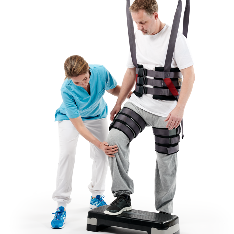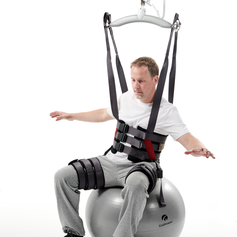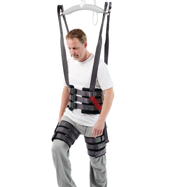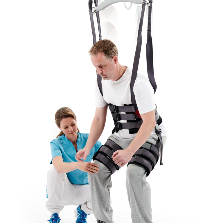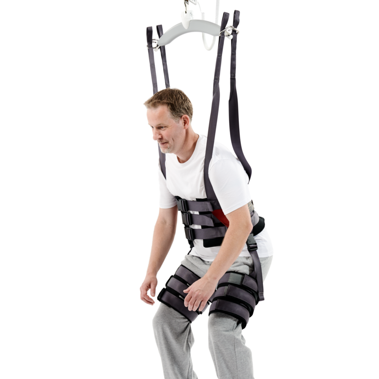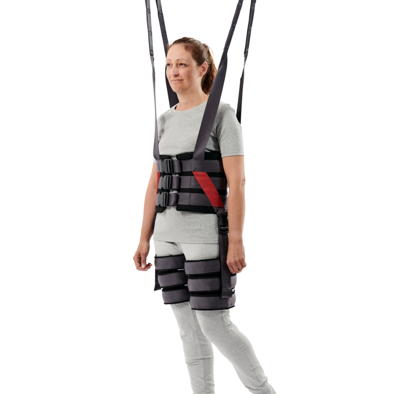 The Gait Trainer is a walking sling for users who have sufficient leg strength to stand upright, but need support and to feel safe during training due to reduced balance. The Gait Trainer sling provides the needed support during walking and gait training and helps the user maintain standing.