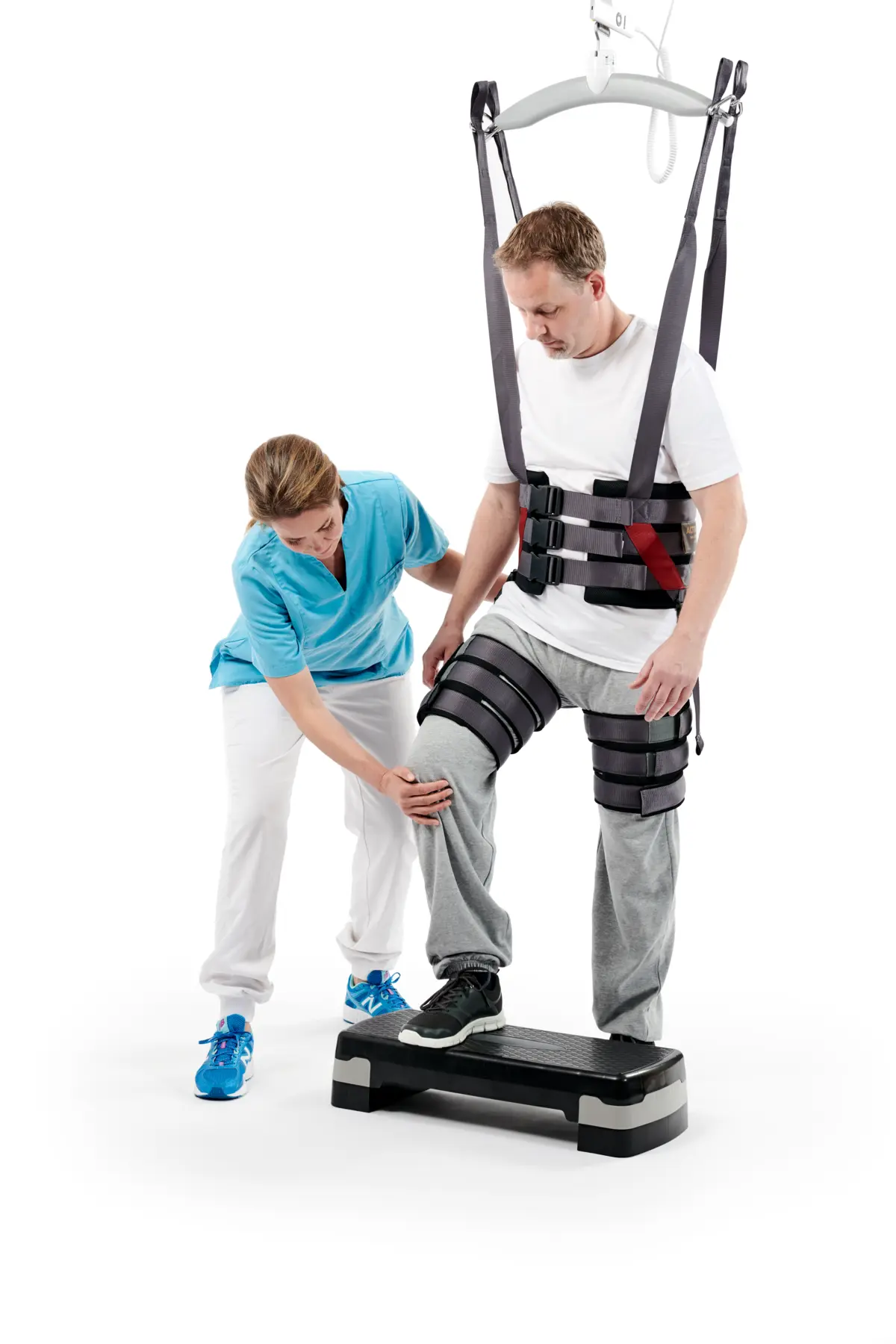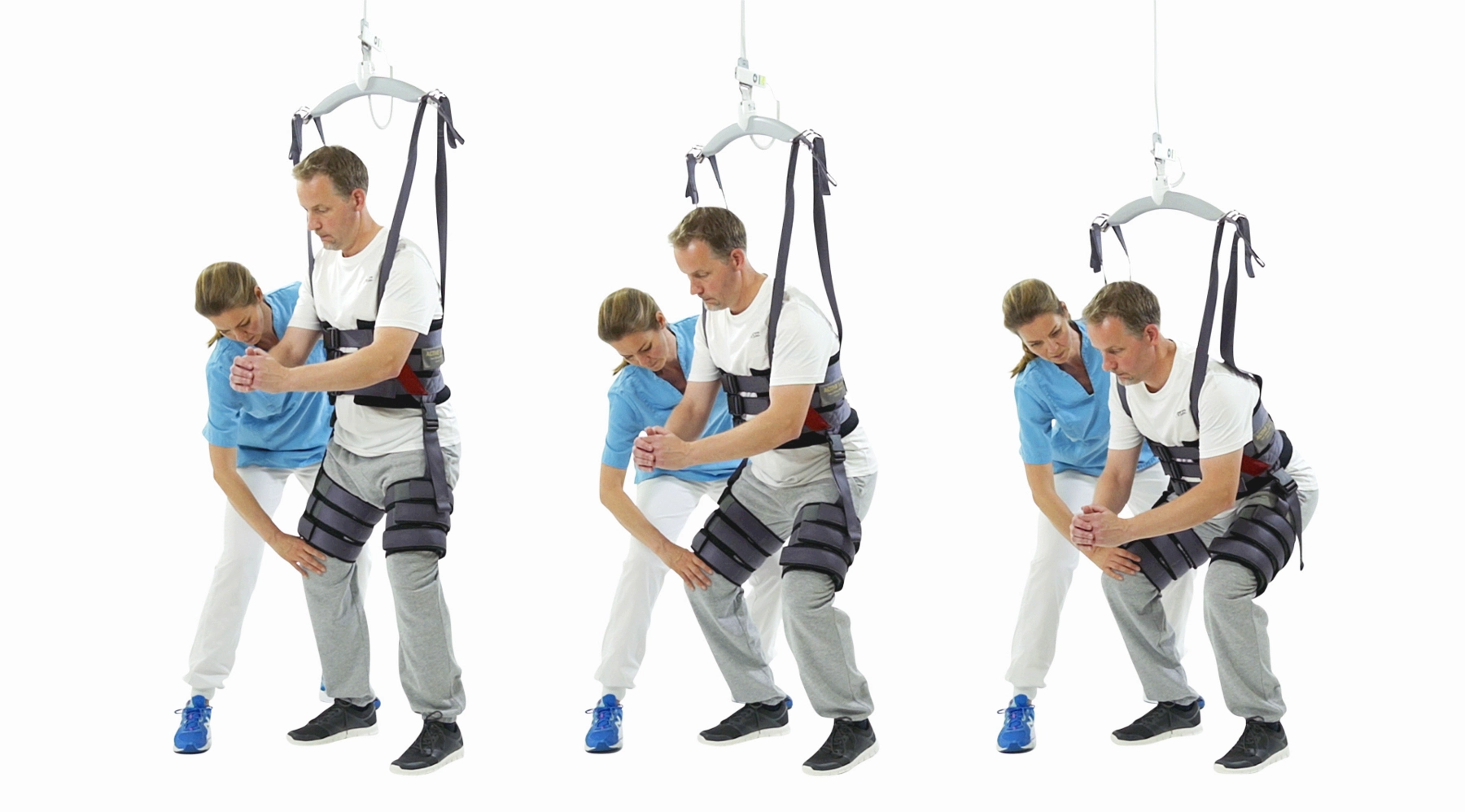 The sling supports the upper part of the body and has leg cuffs for enhanced safety. The Gait Trainer is ideal for the early mobilisation of patients, balance training, different kinds of standing or sitting exercises and gait training, and provides confidence and safety for both user and carer.