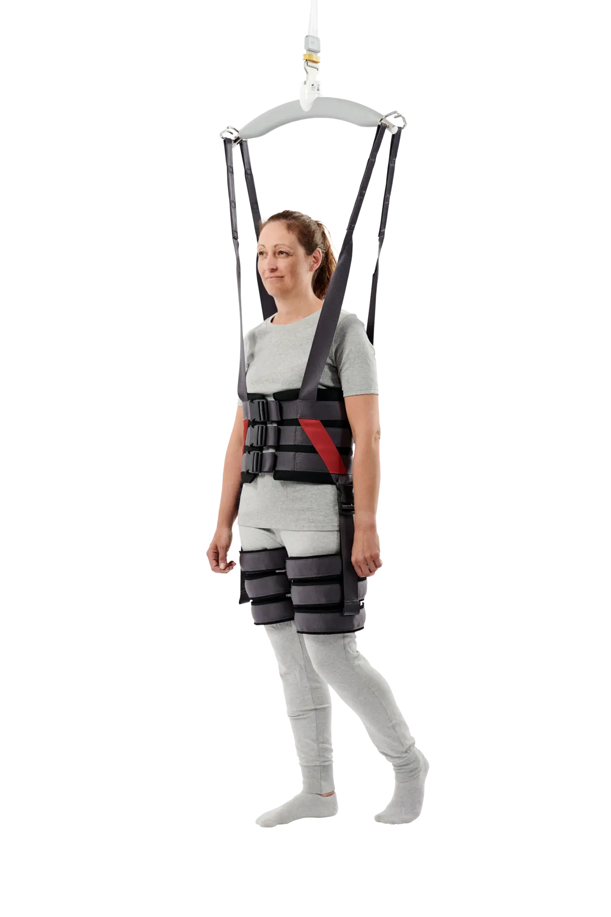 The Gait Trainer is a walking sling for users who have sufficient leg strength to stand upright, but need support and to feel safe during training due to reduced balance. The Gait Trainer sling provides the needed support during walking and gait training and helps the user maintain standing.