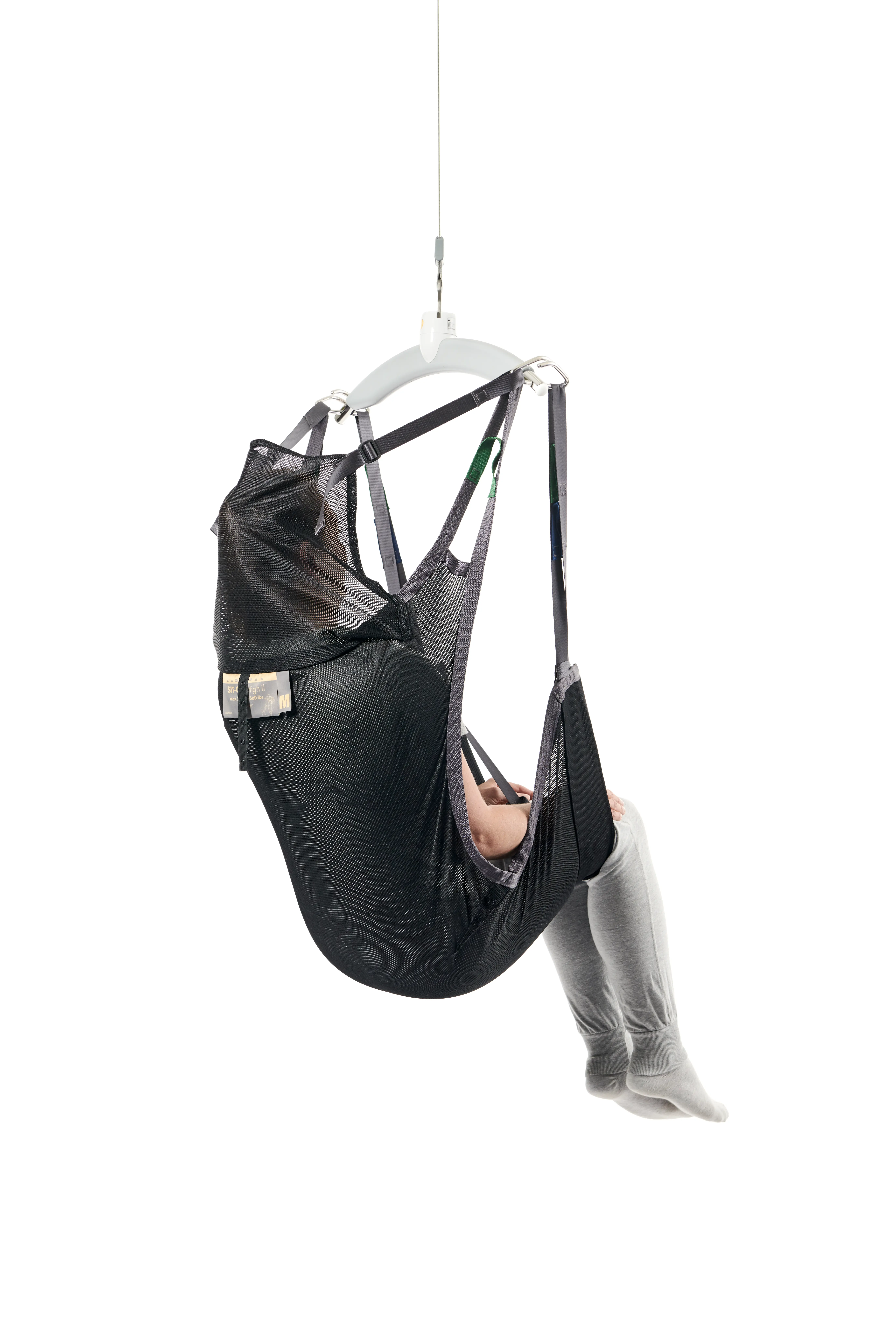 The Sit-On High II is a sling designed for lifting and moving users who need to stay sitting on the sling for long periods due to high weight or customized wheelchair.